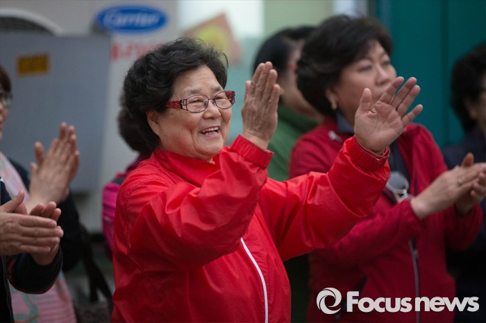 (서울=포커스뉴스) 6일 오후 서울 강동구 천호동 인근의 한 아파트 앞에서 이재영 새누리당 후보가 유세를 하는 동안 시민들이 유세 봉사자들과 춤을 보고 박수를 보내고 있다.