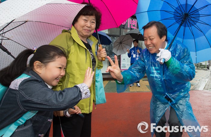 (청주=포커스뉴스) 7일 오전 충북 청주시 흥덕구 복대사거리에서 도종환 더불어민주당 후보가 출근길 시민들에게 인사를 하며 지지를 호소하고 있다.