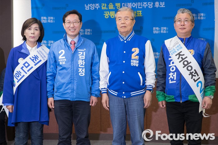 (남양주=포커스뉴스) 7일 오전 경기도 남양주시청에서 공동정책 공약 발표에 앞서 최민희(왼쪽부터) 더불어민주당 남양주병 후보, 김한정 더불어민주당 남양주을 후보, 김종인 더불어민주당 비대위 대표, 조응천 더불어민주당 남양주갑 후보가 기념촬영을 하고 있다.
