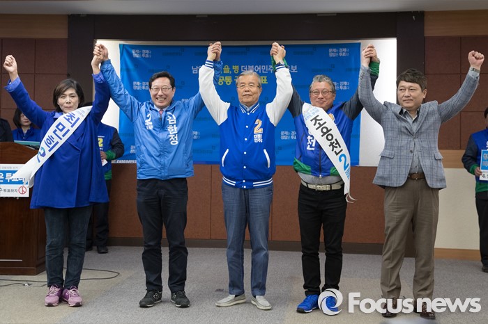 (남양주=포커스뉴스) 7일 오전 경기도 남양주시청에서 공동정책 공약 발표에 앞서 최민희(왼쪽부터) 더불어민주당 남양주병 후보, 김한정 더불어민주당 남양주을 후보, 김종인 더불어민주당 비대위 대표, 조응천 더불어민주당 남양주갑 후보, 최재성 의원이 기념촬영을 하고 있다.