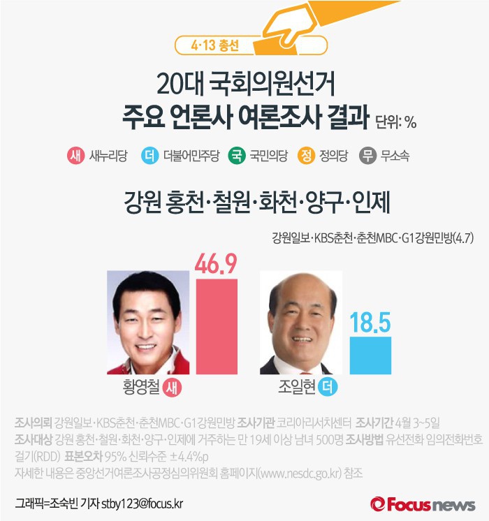(서울=포커스뉴스) 강원일보·KBS춘천·춘천MBC·G1강원민방이 공동으로 여론조사기관 코리아리서치에 의뢰해 7일 발표한 자료에 따르면 강원 홍천·철원·화천·양구·인제에서 새누리당 황영철 후보의 지지율은 46.9%, 더민주 조일현 후보의 지지율은 18.5%로 조사됐다.
