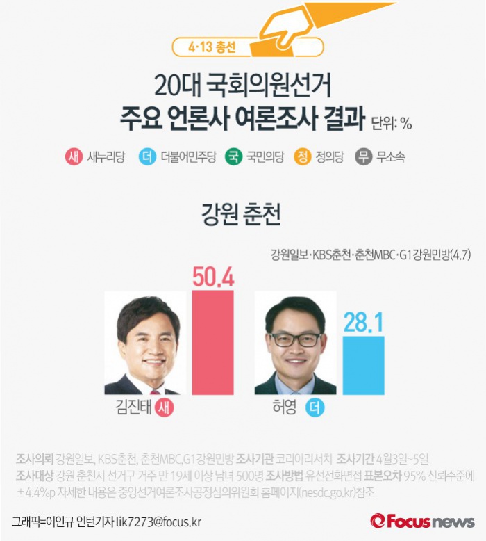 (서울=포커스뉴스) 강원일보·KBS춘천·춘천MBC·G1강원민방이 여론조사기관 코리아리서치에 의뢰해 7일 발표한 결과에 따르면 강원 춘천에서 새누리당 김진태 후보의 지지율은 50.4%, 더불어민주당 허영 후보의 지지율은 28.1%인 것으로 나타났다.