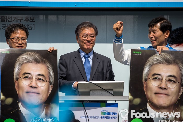 (군포=포커스뉴스) 문재인 더불어민주당 전 대표가 7일 오전 경기도 군포시 산본중심상가를 방문해 유권자들에게 이학영 군포시을 후보, 김정우 군포시갑 후보 지지 연설을 마친 뒤 한 지지자가 가져온 지난 대통령 선거 포스터를 보고 있다.
