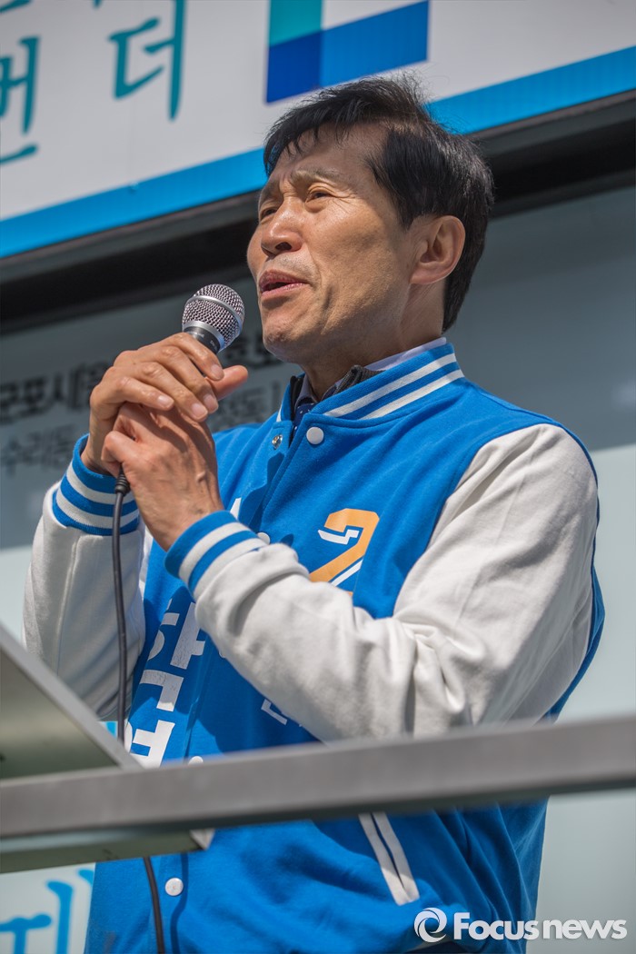 (군포=포커스뉴스) 이학영 더불어민주당 군포시을 후보가 7일 오전 경기도 군포시 산본중심상가에서 유권자들에게 한 표를 호소하고 있다.
