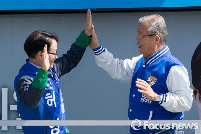 (춘천=포커스뉴스) 7일 강원도 춘천풍물시장 인근에서 김종인 더불어민주당 비대위 대표와 허영 더불어민주당 춘천 후보가 유세를 펼치며 하이파이브를 하고 있다.