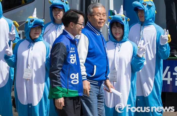 (춘천=포커스뉴스) 7일 강원도 춘천풍물시장 인근에서 김종인 더불어민주당 비대위 대표와 허영 더불어민주당 춘천 후보가 유권자들에게 지지를 호소하기 위대 단상으로 향하고 있다.
