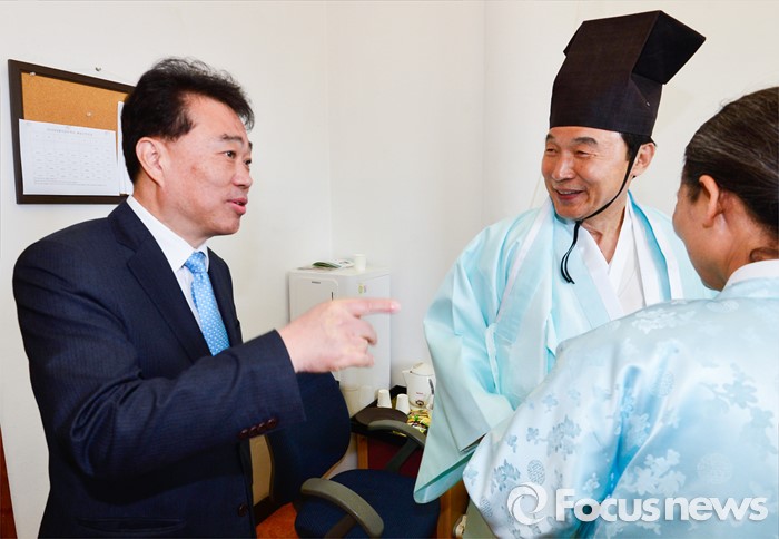 (남양주=포커스뉴스) 손학규(오른쪽) 전 더불어민주당 상임고문이 7일 오전 경기 남양주 다산유적지에서 열린 다산 정약용 선생 180주기 묘제에 초헌관으로 참석한 뒤 김성수 당 대변인과 대화하고 있다. 이날 김종인 비대위 대표 겸 선대위원장은 손 전 상임고문의 20대 총선 지원을 공식 요청했다.