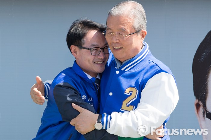 (춘천=포커스뉴스) 7일 강원도 춘천풍물시장 인근에서 김종인 더불어민주당 비대위 대표와 허영 더불어민주당 춘천 후보가 유세를 펼치며 포옹을 하고 있다.