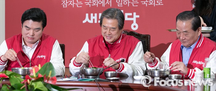 (서울=포커스뉴스) 7일 오전 서울 여의도 새누리당사에서 김무성(가운데) 대표와 원유철(왼쪽) 원내대표, 서청원 최고위원이 공동선대위원장 긴급회의에 참석해, 비빔밥을 먹고 있다.