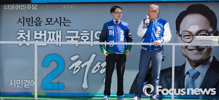 (춘천=포커스뉴스) 7일 강원도 춘천풍물시장 인근에서 김종인 더불어민주당 비대위 대표와 허영 더불어민주당 춘천 후보가 유권자들에게 지지를 호소하고 있다.