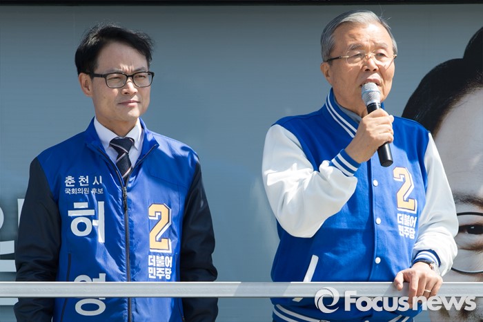 (춘천=포커스뉴스) 7일 강원도 춘천풍물시장 인근에서 김종인 더불어민주당 비대위 대표와 허영 더불어민주당 춘천 후보가 유권자들에게 지지를 호소하고 있다.