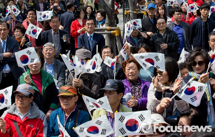 (서울=포커스뉴스) 7일 오후 서울 마포구 늘장공원에서 열린 안대희 새누리당 마포갑 후보 집중유세장에 모인 시민들이 태극기를 흔들며 지지를 보내고 있다.