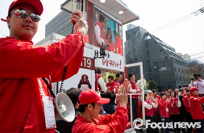 (서울=포커스뉴스) 7일 오후 서울 마포구 늘장공원에서 열린 안대희 새누리당 마포갑 후보 집중유세장에서 붉은 의상의 선거운동원들이 박수를 치고 있다.
