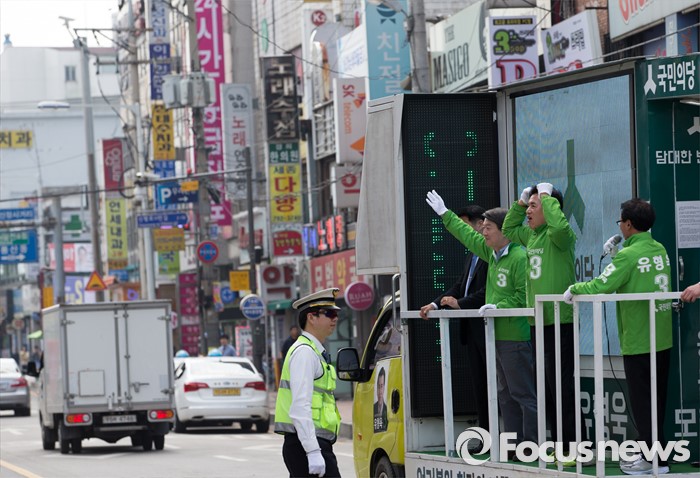 (하남=포커스뉴스) 7일 오후 경기 하남 신장시장 앞에서 안철수 국민의당 상임공동대표가 유형욱 국민의당 하남시 후보 지원유세를 하고 있다.