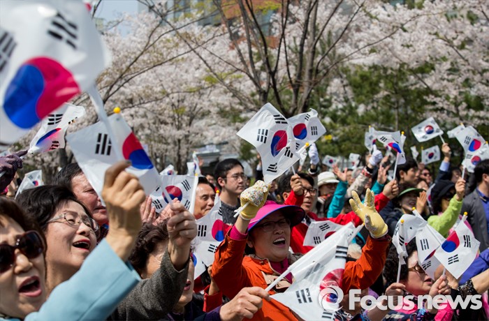 (서울=포커스뉴스) 7일 오후 서울 마포구 늘장공원에서 열린 안대희 새누리당 마포갑 후보 집중유세장에 모인 시민들이 태극기를 흔들며 지지를 보내고 있다.