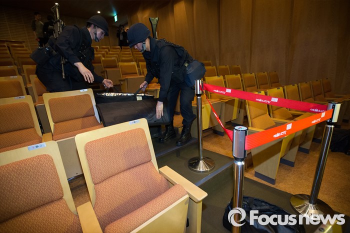(서울=포커스뉴스) 7일 오후 서울 서초구 예술의전당 음악당에서 열린 유관 기관 합동 대테러훈련에서 경찰들이 폭발 의심물을 처리하고 있다. 이번 훈련은 공연 도중 폭발 의심물체가 발견된 상황을 설정해 훈련을 진행했다.