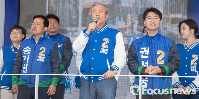 (원주=포커스뉴스) 7일 오후 강원도 원주중앙시장 인근에서 송기헌 더불어민주당 원주을 후보, 김종인 더불어민주당 비대위 대표, 권성중 더불어민주당 원주갑 후보가 유권자들에게 지지를 호소하고 있다.