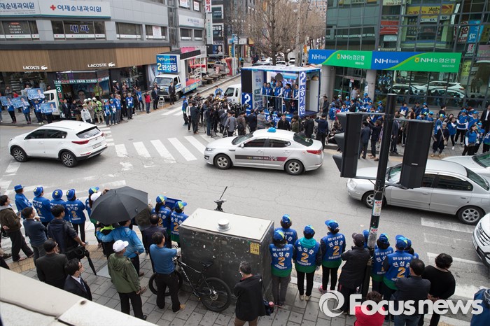 (원주=포커스뉴스) 7일 오후 강원도 원주중앙시장 인근에서 송기헌 더불어민주당 원주을 후보, 김종인 더불어민주당 비대위 대표, 권성중 더불어민주당 원주갑 후보가 유권자들에게 지지를 호소하고 있다.