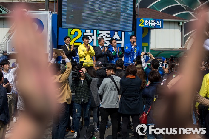(인천=포커스뉴스) 송영길 더불어민주당 인천광역시 계양구을 후보가 7일 오후 인천광역시 지하철1호선 주안역 남광장에서 열린 인천 지역 후보 합동유세에서 유권자들에게 야권 지지를 호소 하고 있다.