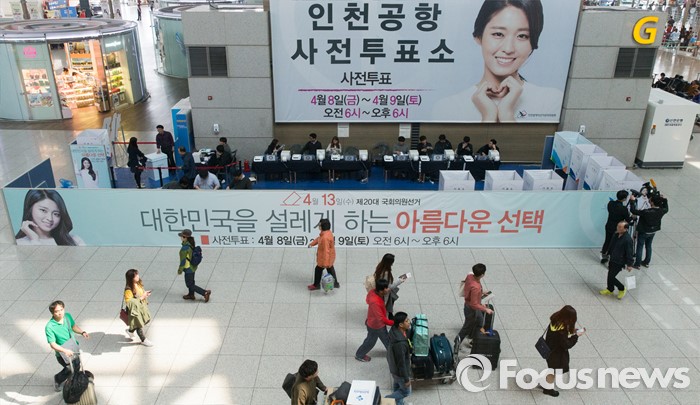 (인천공항=포커스뉴스) 제20대 국회의원 선거 사전투표를 하루 앞둔 7일 오후 인천국제공항 출국장에 사전투표소가 설치되어 있다.