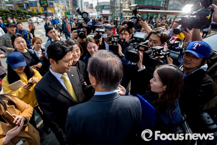 (인천=포커스뉴스) 문재인 더불어민주당 전 대표가 7일 오후 인천광역시 지하철1호선 주안역 남광장에서 열린 인천 지역 후보 합동유세를 마친 뒤 김광진 더불어민주당 의원과 대화를 나누고 있다.
