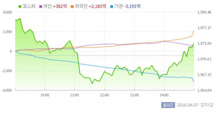 이날 코스피는 1978.75로 상승 출발했다. 이후 지수는 삼성전자의 1분기 호실적 소식에 1970선대에서 강보합세를 나타냈다. 장 중반 보합권을 중심으로 횡보세를 보이다가 장 막판 강보합으로 마감했다.