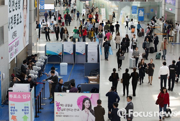 (인천공항=포커스뉴스) 제20대 국회의원 선거 사전투표를 하루 앞둔 7일 오후 인천국제공항 출국장에 사전투표소가 설치되어 있다.