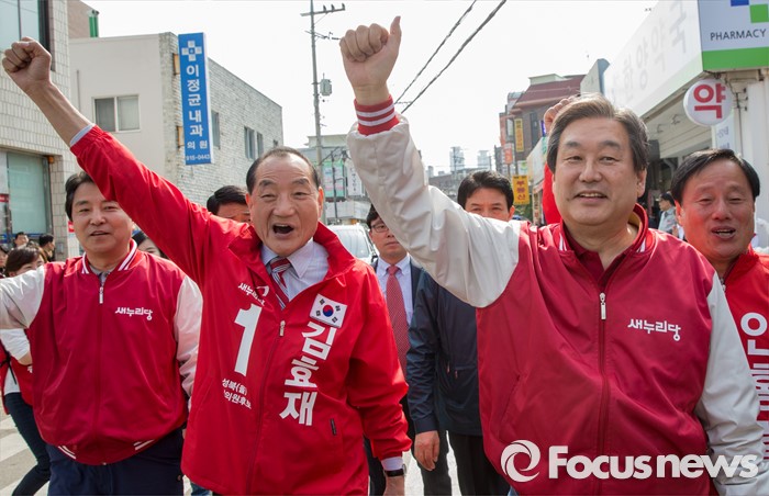 (서울=포커스뉴스) 7일 오후 서울 성북구 장위시장 앞에서 열린 김효재 새누리당 성북구을 후보 지원유세에 나선 김무성 대표가 유권자들의 지지를 호소하고 있다.