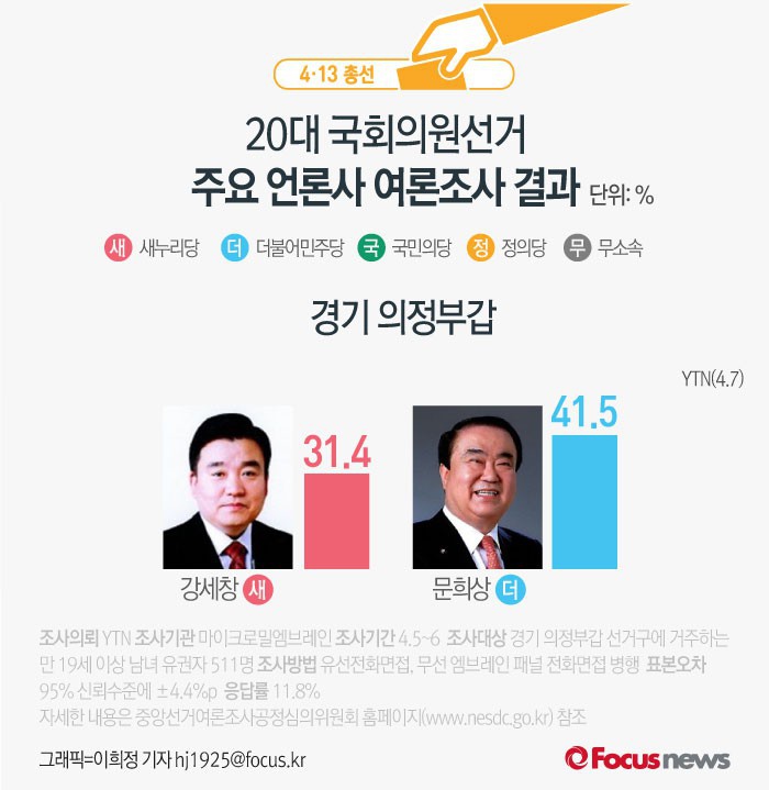 (서울=포커스뉴스) YTN이 마이크로밀엠브레인에 의뢰해 7일 발표한 경기 의정부갑 여론조사 결과에 따르면 새누리당 강세찬 후보의 지지율은 31.4%, 더불어민주당 문희상 후보의 지지율은 41.5%로 나타났다.