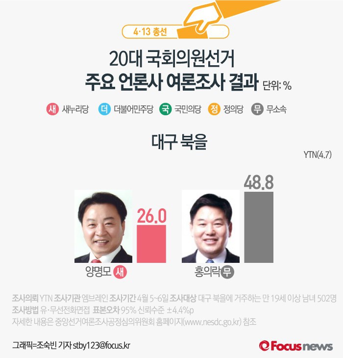 (서울=포커스뉴스) YTN이 여론조사기관 엠브레인에 의뢰해 7일 발표한 결과에 따르면 대구 북을에서 새누리당 양명모 후보의 지지율은 26.0%, 무소속 홍의락 후보의 지지율은 48.8%인 것으로 나타났다.