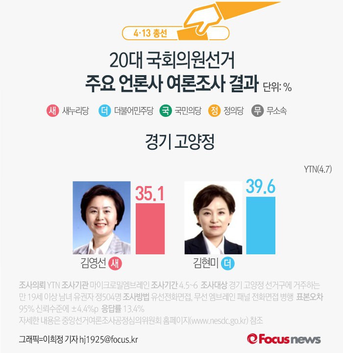 (서울=포커스뉴스) YTN이 마이크로밀엠브레인에 의뢰해 7일 발표한 경기 고양정 여론조사 결과에 따르면 새누리당 김영선 후보의 지지율은 35.1%, 더불어민주당 김현미 후보의 지지율은 39.6%로 나타났다.