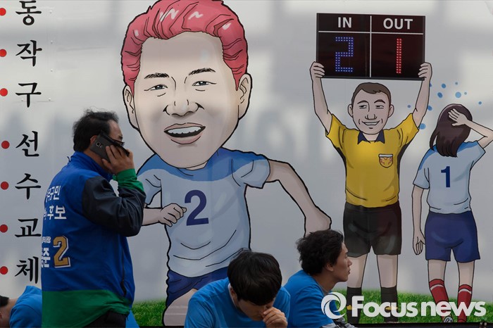(서울=포커스뉴스) 20대 총선을 6일 앞둔 7일 오후 서울 동작구 남성역 골목시장 인근에서 허동준 더불어민주당 동작구을 후보측 선거운동원들이 휴식을 취하고 있다.