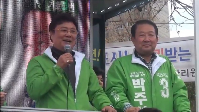 남진의 박주선 후보에 대한 지원유세는 이번이 처음이 아니다. 남진은 지난 2012년 19대 총선에서도 박주선 후보를 지지하기 위해 온종일 지역구의 전통시장과 상가를 누빈 바 있다.7일 가수 남진이 박주선 국민의당 광주 동남을 후보에 대한 지원 유세에 나섰다.<사진출처=유투브 영상 캡쳐>