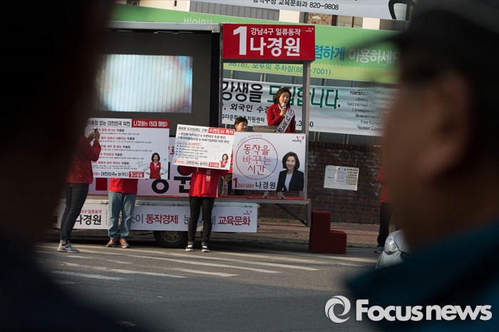 (서울=포커스뉴스) 20대 총선을 6일 앞둔 7일 오후 서울 동작구 흑석빗물펌프장 인근에서 나경원 새누리당 동작구을 후보가 선거유세를 하고 있다.