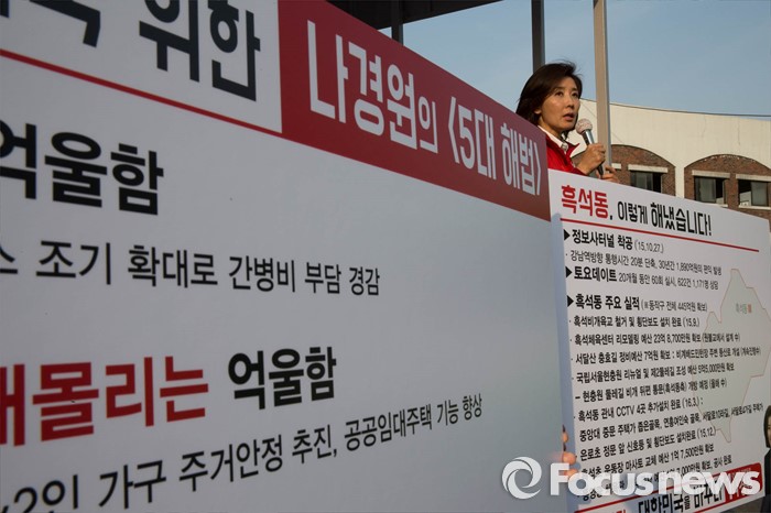 (서울=포커스뉴스) 20대 총선을 6일 앞둔 7일 오후 서울 동작구 흑석빗물펌프장 인근에서 나경원 새누리당 동작구을 후보가 선거유세를 하고 있다.