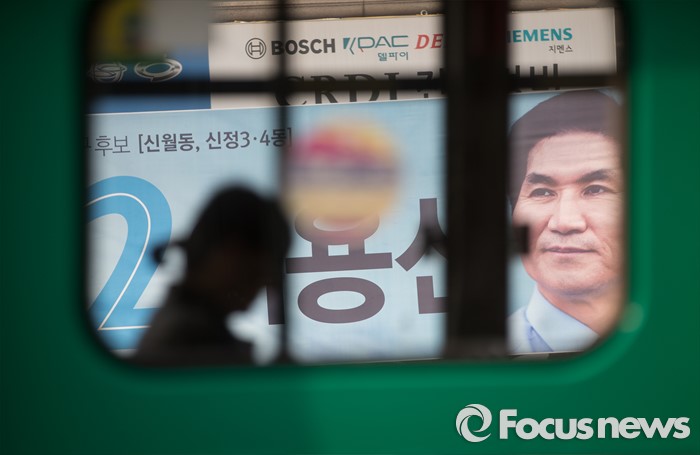 (서울=포커스뉴스) 이용선 더불어민주당 양천구을 후보가 7일 오후 서울 양천구 신월동 신월시장에서 선거운동을 하고 있는 가운데 버스 차창 너머로 이 후보의 대형 플래카드가 보이고 있다.