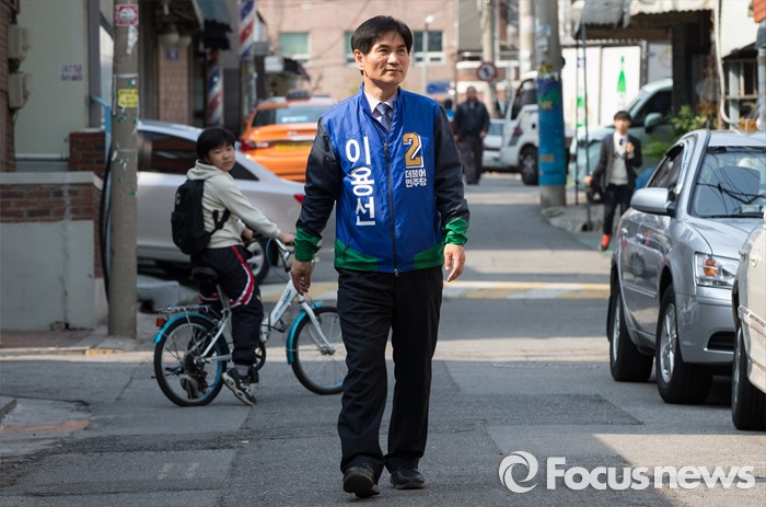 (서울=포커스뉴스) 이용선 더불어민주당 양천구을 후보가 7일 오후 서울 양천구 신월동 신월시장에서 선거운동을 하고 있다.