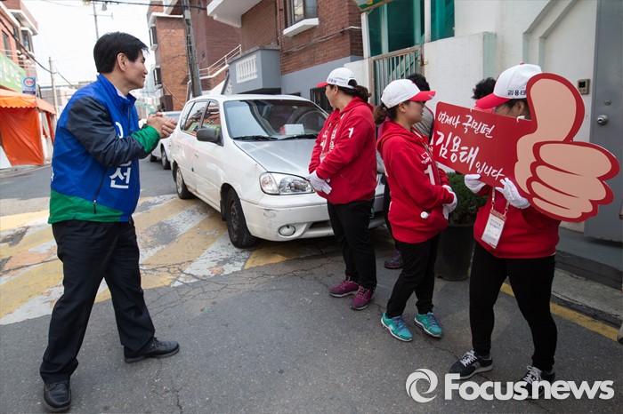 (서울=포커스뉴스) 이용선 더불어민주당 양천구을 후보가 7일 오후 서울 양천구 신월동 신월시장에서 선거운동을 하던 중 기호 1번 김용태 후보의 선거운동원들을 만나 대화하고 있다.