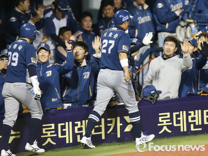 (서울=포커스뉴스) 7일 서울 잠실구장에서 열린 2016 프로야구 NC-두산 경기 3회 1사 2,3루에서 NC 손시헌의 우익수앝 안타로 홈인한 이호준, 이종욱이 덕아웃 동료들과 하이파이브하고 있다.