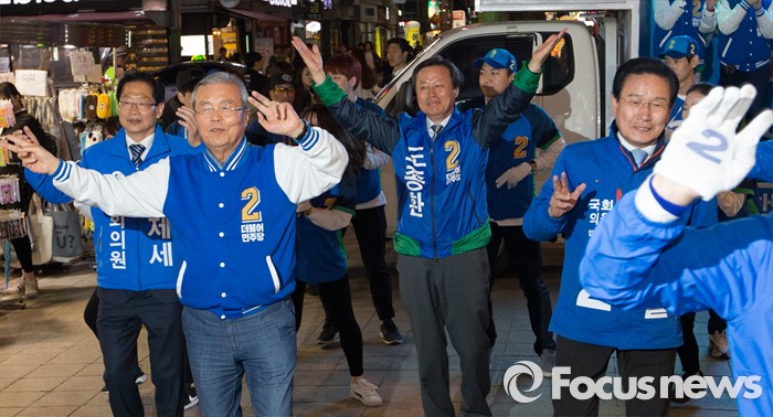 (청주=포커스뉴스) 김종민 더불어민주당 대표가 7일 오후 충북 청주 상당구 성안길에서 율동을 하며 청주시 후보에 대한 지지를 호소하고 있다.