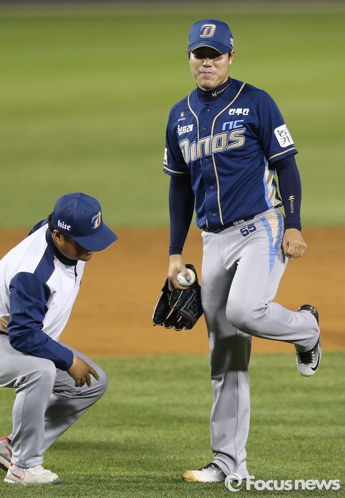 (서울=포커스뉴스) 7일 서울 잠실구장에서 열린 2016 프로야구 NC-두산 경기에서 NC 투수 김진성이 9회 등판해 두산 민병헌의 타구에 다리를 맞고 트레이너의 치료를 받고 있다.