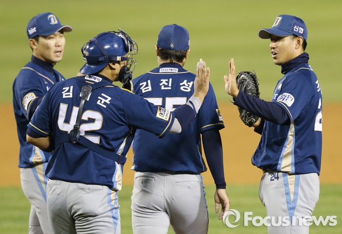 (서울=포커스뉴스) 7일 서울 잠실구장에서 열린 2016 프로야구 NC-두산 경기에서 두산을 8-2로 물리친 NC의 김태군과 조영훈이 하이파이브를 하고 있다.