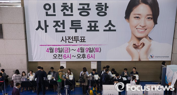 (인천공항=포커스뉴스) 제20대 국회의원 선거 사전투표 시작일인 8일 오전 인천국제공항 출국장에서 유권자들이 사전투표를 하고 있다.