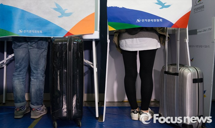 (인천공항=포커스뉴스) 제20대 국회의원 선거 사전투표 시작일인 8일 오전 인천국제공항 출국장에서 유권자들이 사전투표를 하고 있다.