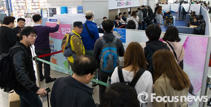 (인천공항=포커스뉴스) 제20대 국회의원 선거 사전투표 시작일인 8일 오전 인천국제공항 출국장에서 유권자들이 사전투표를 하기 위해 줄을 서고 있다.