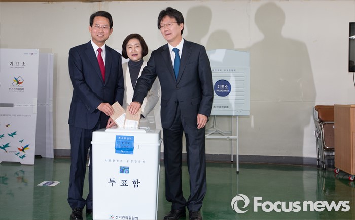(대구=포커스뉴스) 무소속 유승민(대구 동을, 오른쪽부터), 권은희(대구 북갑), 류성걸(대구 동갑) 후보가 8일 오전 대구 북구 산격3동 주민센터에 마련된 사전투표소에서 사전투표를 하고 있다.