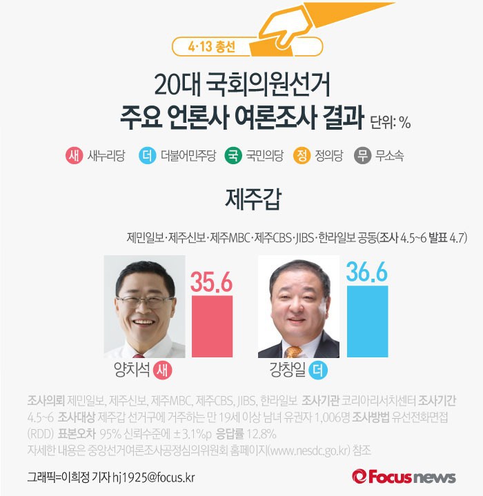(서울=포커스뉴스) 제주신보와 제민일보, 한라일보, 제주MBC, 제주CBS, JIBS제주방송 등 제주지역 언론 6사가 코리아리서치센터에 의뢰해 5~6일 실시한 제주갑 여론조사 결과에 따르면 새누리당 양치석 후보의 지지율은 35.6%, 더불어민주당 강창일 후보의 지지율은 36.6%로 나타났다.