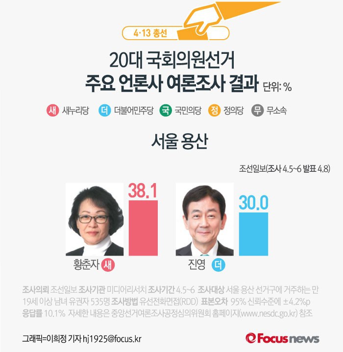 (서울=포커스뉴스) 조선일보가 미디어리서치에 의뢰해 5~6일 실시한 서울 용산 여론조사 결과에 따르면 새누리당 황춘자 후보의 지지율은 38.1%, 더불어민주당 정세균 후보의 지지율은 30.0%로 나타났다.