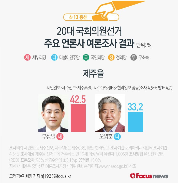 (서울=포커스뉴스) 제주신보와 제민일보, 한라일보, 제주MBC, 제주CBS, JIBS제주방송 등 제주지역 언론 6사가 코리아리서치센터에 의뢰해 5~6일 실시한 제주을 여론조사 결과에 따르면 새누리당 부상일 후보의 지지율은 42.5%, 더불어민주당 오영훈 후보의 지지율은 33.2%로 나타났다.