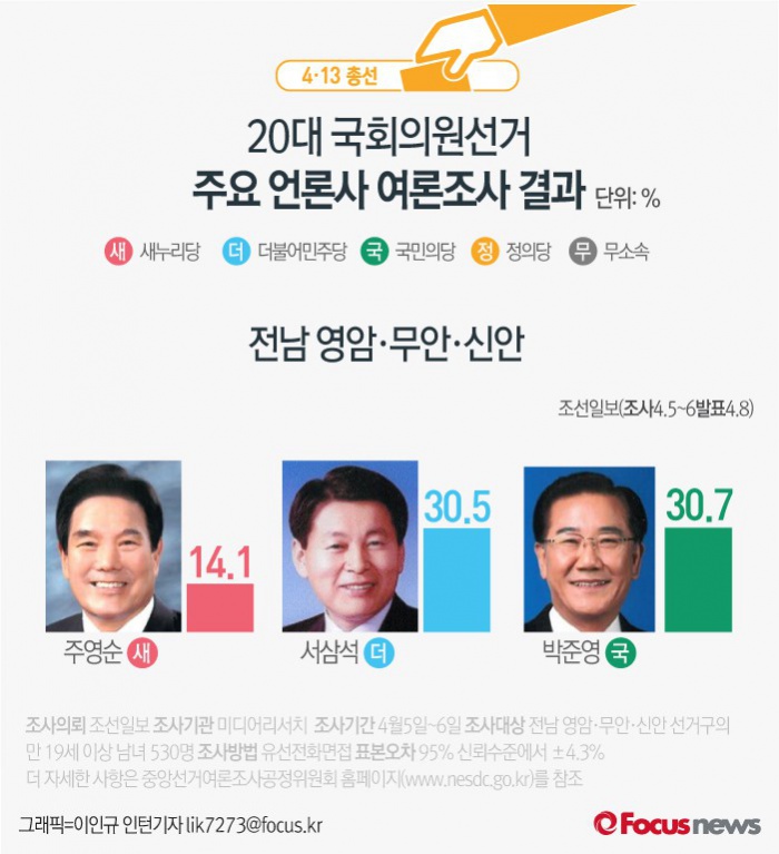 조선일보가 여론조사기관 미디어리서치에 의뢰해 8일 발표한 결과에 따르면 전남 영암·무안·신안에서 지지도 1·2위인 후보의 지지율 격차는 0.2%p에 그쳤다.